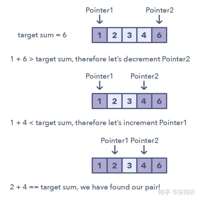 我们需要双指针的原因是:如果你只用一个指针的话,你得来回跑才能在数组中找到你需要的答案。这一个指针来来回回的过程就很耗时和浪费空间了 — 这是考虑算法的复杂度分析的时候的重要概念。虽然brute force一个指针的解法可能会奏效,但时间复杂度一般会是O(n²)。在很多情况下,双指针能帮助我们找到空间或是时间复杂度更低的解。