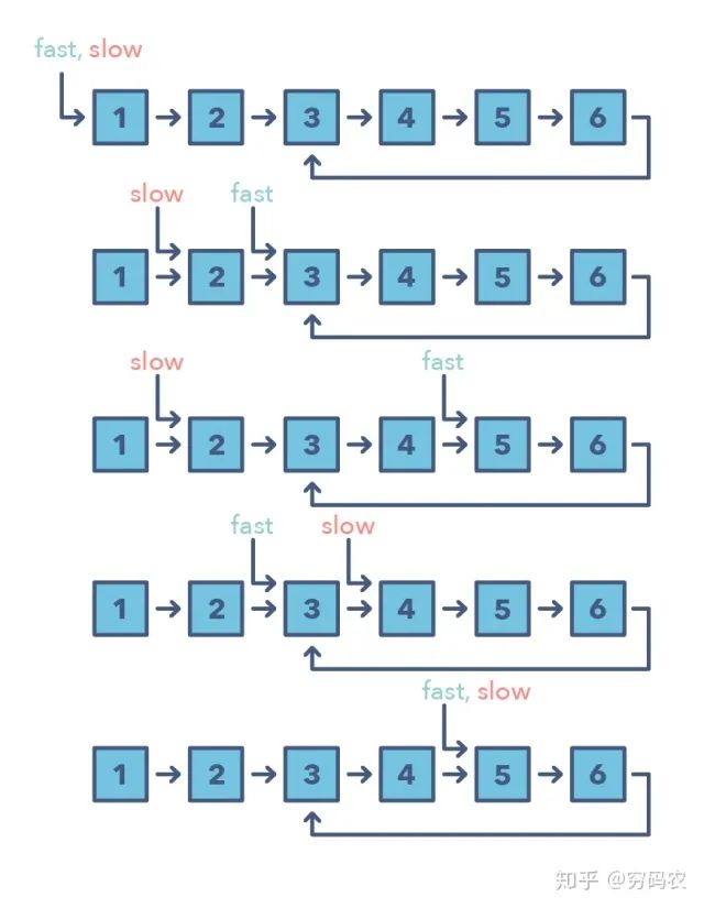 这种模式,有一个非常出门的名字,叫龟兔赛跑。 咱们肯定都知道龟兔赛跑啦。但还是再解释一下快慢指针:这种算法的两个指针的在数组上(或是链表上,序列上)的移动速度不一样。还别说,这种方法在解决有环的链表和数组时特别有用。