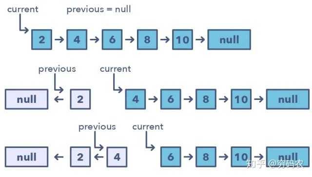 这种模式每次就翻转一个节点。一般需要用到多个变量,一个变量指向头结点(下图中的current),另外一个(previous)则指向咱们刚刚处理完的那个节点。在这种固定步长的方式下,你需要先将当前节点(current)指向前一个节点(previous),再移动到下一个。同时,你需要将previous总是更新到你刚刚新鲜处理完的节点,以保证正确性。