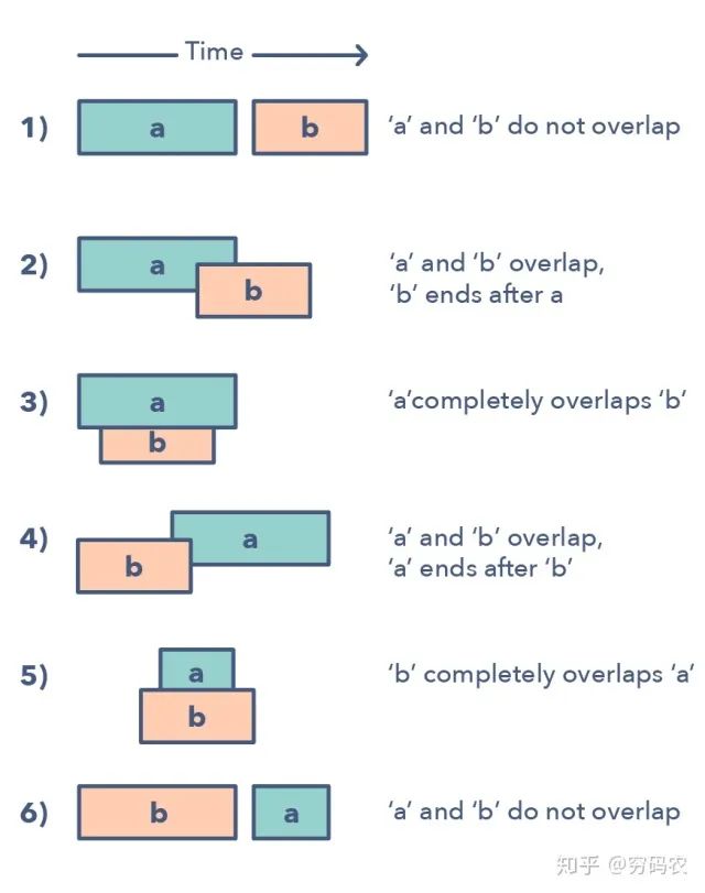 理解和识别这六种情况,灰常重要。因为这能帮你解决一大堆问题。这些问题从插入区间到优化区间合并都有。