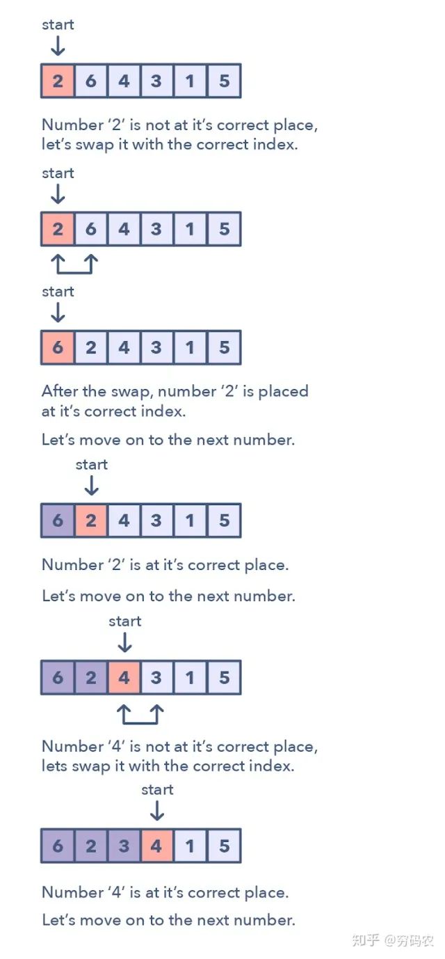 这种模式讲述的是一直很好玩的方法:可以用来处理数组中的数值限定在一定的区间的问题。这种模式一个个遍历数组中的元素,如果当前这个数它不在其应该在的位置的话,咱们就把它和它应该在的那个位置上的数交换一下。你可以尝试将该数放到其正确的位置上,但这复杂度就会是O(n^2)。这样的话,可能就不是最优解了。因此循环排序的优势就体现出来了。