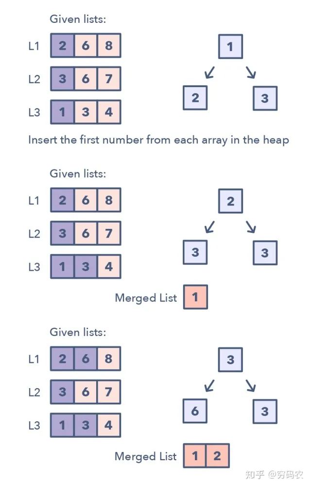 每当你的输入是K个排好序的数组,你就可以用堆来高效顺序遍历其中所有数组的所有元素。你可以将每个数组中最小的一个元素加入到最小堆中,从而得到全局最小值。当我们拿到这个全局最小值之后,再从该元素所在的数组里取出其后面紧挨着的元素,加入堆。如此往复直到处理完所有的元素。