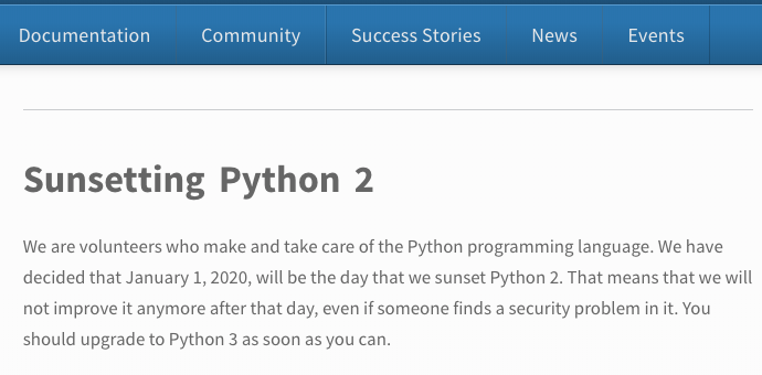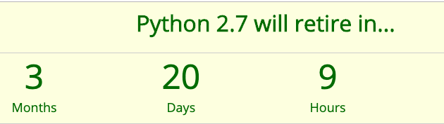 我们是开发和维护 Python 编程语言的志愿者。我们已经决定 2020 年 1 月 1 日将是结束支持 Python 2 的日子。这意味着,即使有人发现 Python 2 中的安全问题,我们也不会在那天之后再改进它。您应该尽快升级到 Python3。