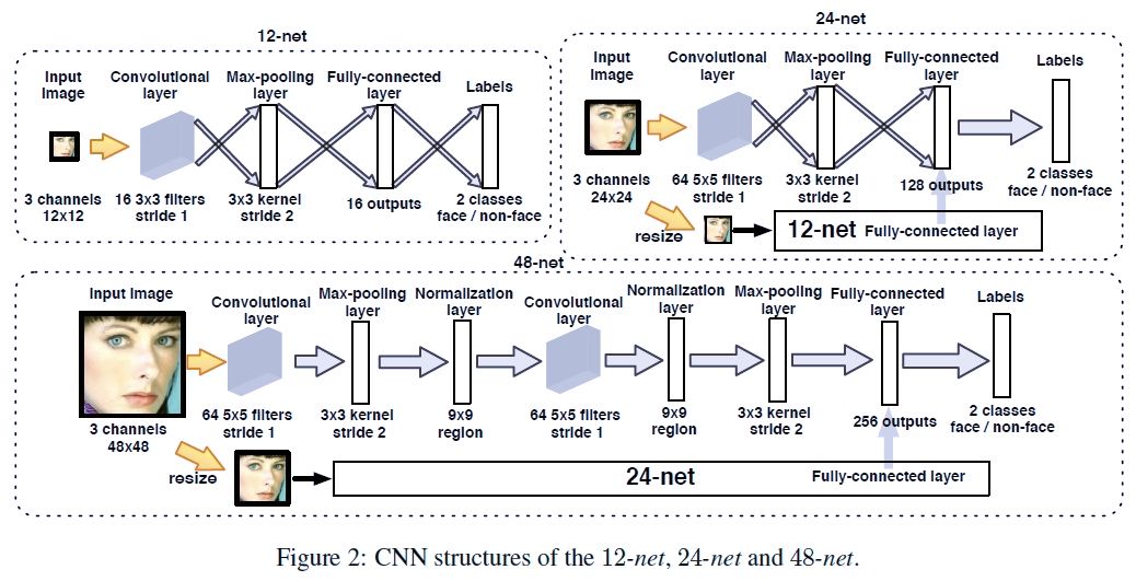 Cascate CNN 的架构。分别使用了 12x12、24x24 和 48x48 的网络,对人脸图像进行三阶段的识别。