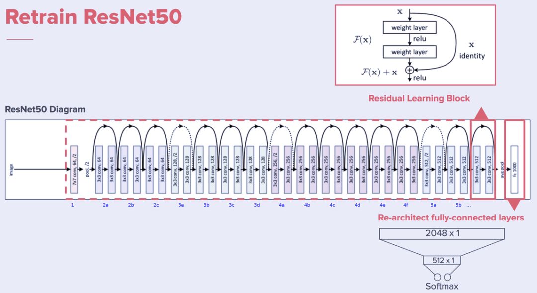 这一模块使用了 ResNet50 的模型架构。如图所示,这一网络将多个残差学习块串联在一起,利用模型的深度学习图像的深层表征。