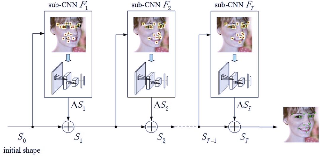 这一模块使用的是 FEC-CNN。如图所示,这也是将人脸图像经过多个 CNN 网络处理,每经过一个网络便获得一个表征,并和上一阶段的输入相乘。在经过了 T 个网络后输出最终的图像关键点。