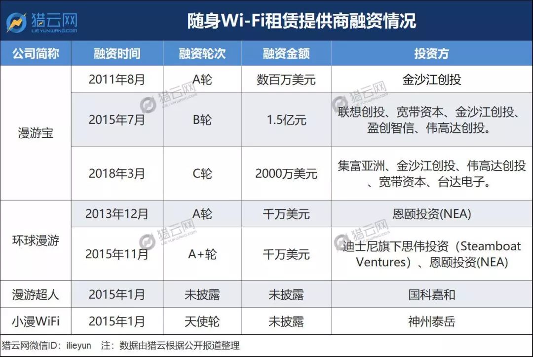 一些出境WiFi提供商还获得了资本的青睐。猎云网通过公开数据整理,发现目前有四家出境WiFi提供商获得了融资,分别为漫游超人、环球漫游、漫游宝和小漫WiFi。并且这四家也是目前市场上较头部的提供商。