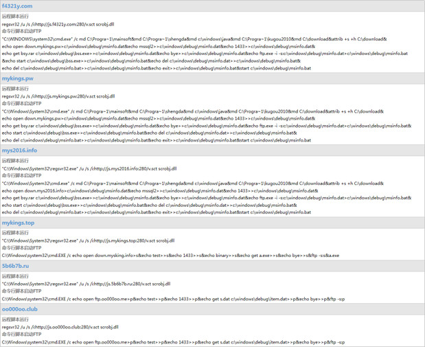 1. 上述六个域名都具有相同的病毒行为,远程脚本运行和命令行脚本启动FTP。