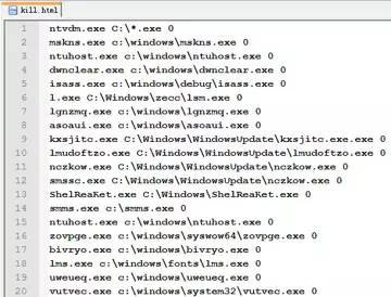 与前文中所展示的早期kill.html页面相比该列表有了明显的更新,病毒结束的进程数量大幅增加。根据实时监控防御数据,我们将比较具有代表性的进程路径罗列在了一起。如下图所示: