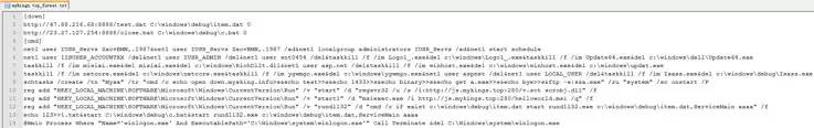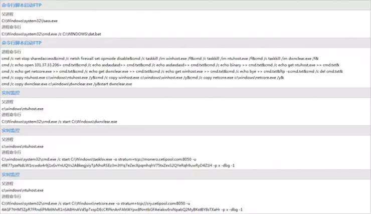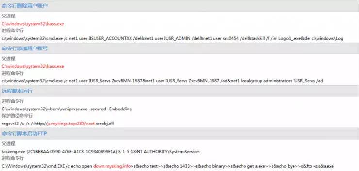 根据上图所示数据,我们可以看出为了争夺这些有限的主机控制权,黑客团伙之间的争夺异常激烈。“隐匿者”通过不断的攻击主机收集到了一些常见的后门账户名,再利用批处理直接对这些常见的后门账号名进行删除操作。