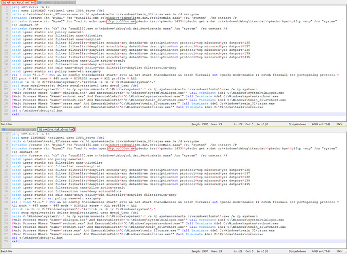 除此之外在同一时间,与两个域名相关攻击所使用的close2.bat脚本也完全相同,脚本中所包含的域名也完全一致(同为ftp.oo000oo.me)。所以我们可以直接得出,与两个域名相关的攻击同属于 “隐匿者”。如下图所示: