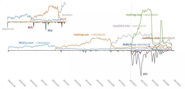通过上图可以看出,f4321y.com、mykings.pw、mys2016.info、mykings.top四个域名在攻击时间和爆发数量上呈现出了此消彼长、持续攻击的威胁态势,且爆发数量有很强的延续性。通常,黑客攻陷的主机数量会不断激增,且黑客为了提高其隐蔽性会不断地更换C&C服务器地址。所以我们初步猜测,上述四个C&C服务器域名可能同属于一个黑客团伙。
