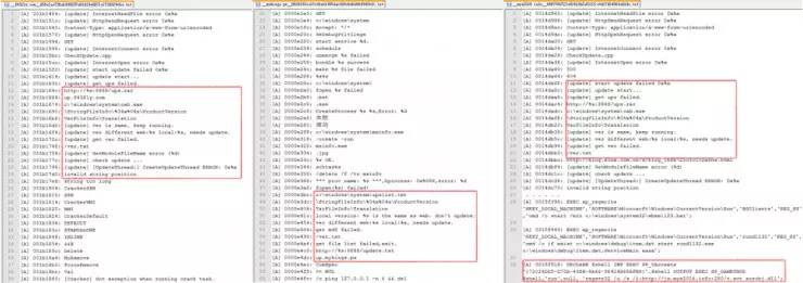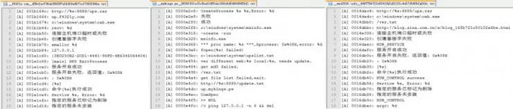 其中f4321y.com、mykings.pw和mys2016.info域名相关样本为同源样本,样本中字符串信息具有很高的相似性。如下图所示: