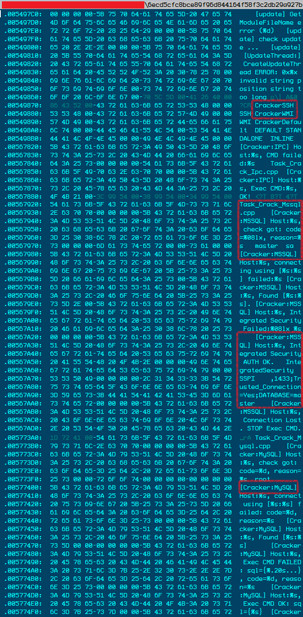 通过对“隐匿者”攻击相关样本字符串特征的整理,我们发现“隐匿者”相关样本中均出现了中文调试信息。如下图所示: