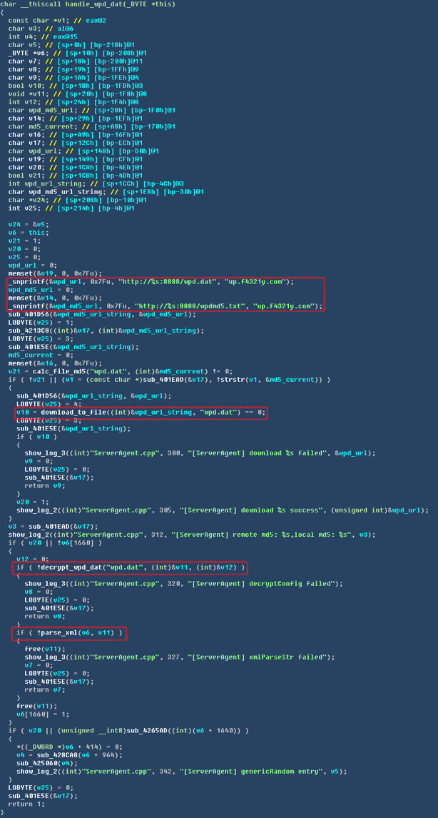病毒攻击所使用的相关数据来自于C&C服务器(在我们所分析的样本中,下载地址为:http:// up.f4321y.com:8888/wpd.dat),数据是进行过加密的。下载后病毒会将wpd.dat文件的md5数值与C&C服务器中wpdmd5.txt中存放的md5数值进行比较,如果相同则进行解密。如下图所示: