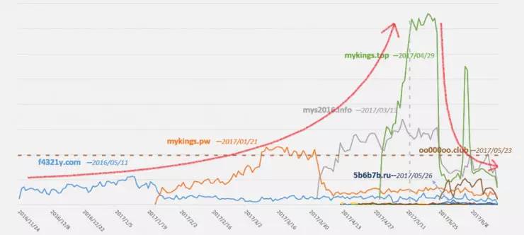 依据上图的红色上升曲线可以看出,该黑客团伙前期攻击所控制的主机数量增长趋势较为平缓。在4月14日“Shadow Brokers”组织泄露出“永恒之蓝”漏洞之后,该黑客团伙可能将“永恒之蓝”漏洞加入到了渗透工具箱中。在此之后,依托其之前攻陷的主机,使利用mykings.top域名的攻击数量在短时间内快速爆发到了一个较高水平。