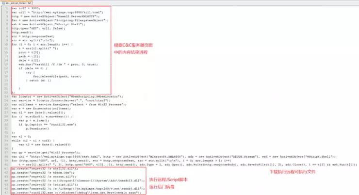 之后,Payload动态库会注册WMI脚本执行从远端服务器获取到的名为item.dat的后门程序,并执行存放在远端C&C服务器的JScript脚本。病毒注册的WMI脚本,如下图所示: