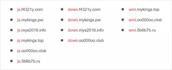二级域名按C&C功能命名,分别包括“js.”、“down.”和“wmi.”三种域名形式。如下图所示: