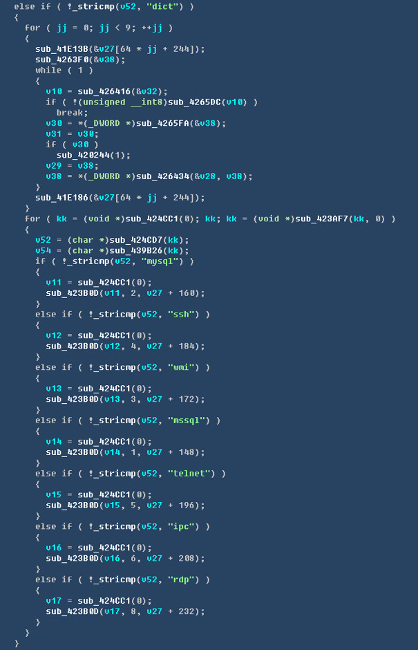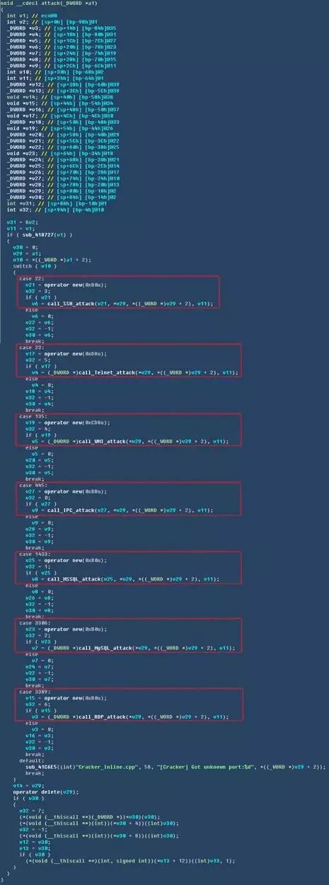 根据扫描主机的开放端口,病毒会采用如上图所示的攻击方式进行攻击。如下图所示: