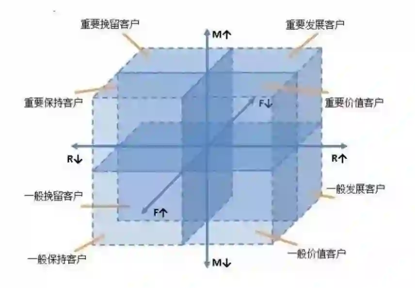 下图是一种消费用户分群的方式,以消费金额Monetary、消费频率Frequency和最近一次消费时间Recency,得到8个象限的用户,可以对不同的用户进行不同的运营推广策略。