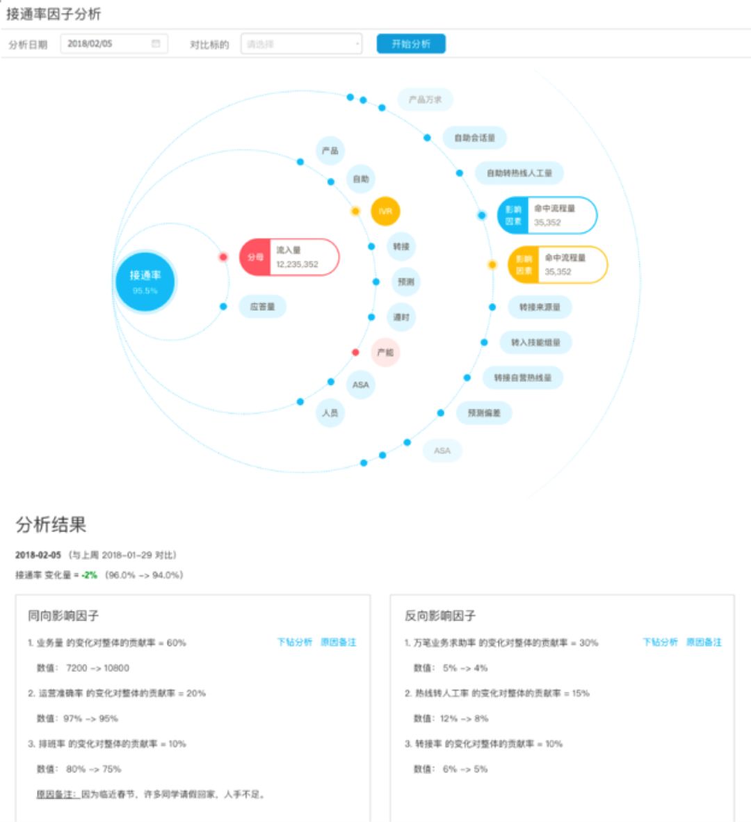 比如对热线接通率进行业务诊断,接通率分母是热线流入量,流入量是客户需求通过自助、转人工等,直到流转到热线处理环节的咨询量,因此流入量相关的影响因素有:产品、自助、智能派单、转接等;接通率的分子为热线应答量,应答量和通话时长、排班人数(人员)、现场运营效率(产能)等有关。通过下图把指标之间的关系环状表达出来,当选中某一指标后,该指标相关的影响指标也会高亮。而后台计算出的分析结果会给出指标波动的影响因子和各因子的贡献度。