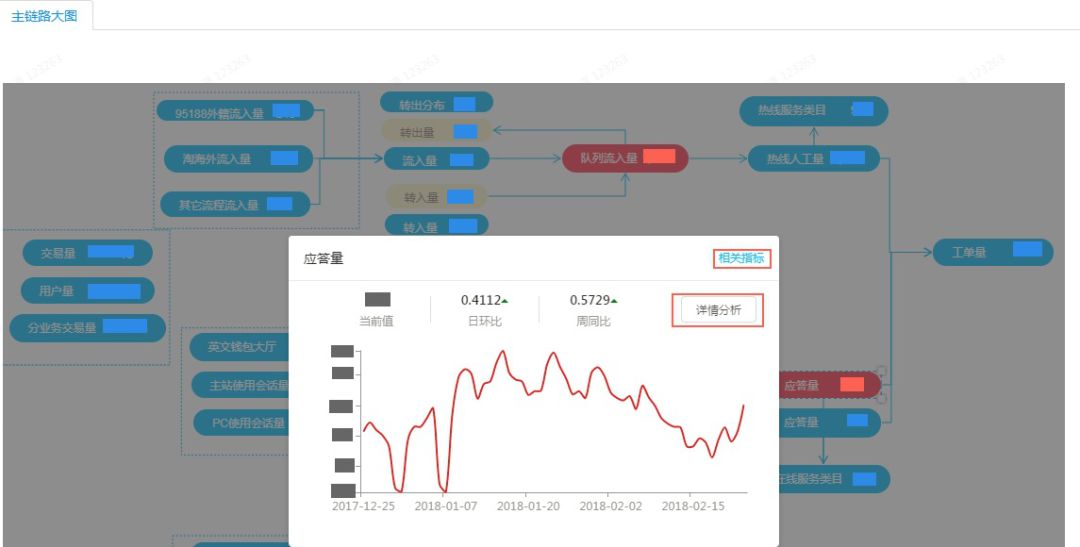 一个节点可以配置多个指标,主指标和相关指标。鼠标悬浮于节点可展示主指标及相关指标的趋势图,如果想进一步分析,可点击详情分析进入指标的下钻分析页面。