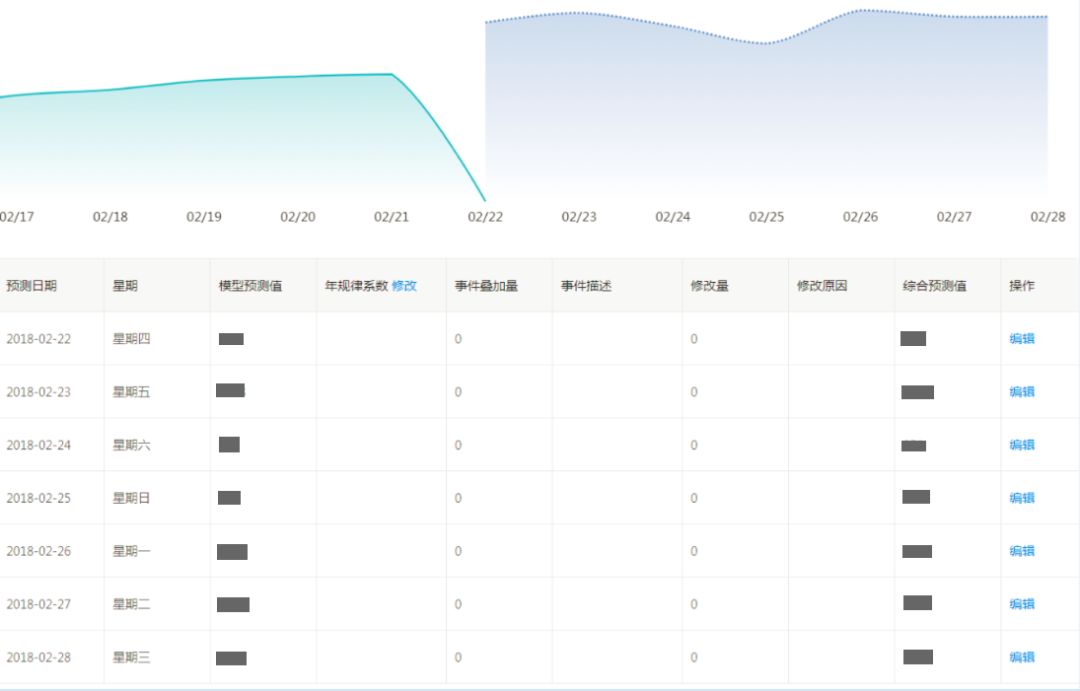 即可出现如下所示的话务量趋势图,并且可以根据自己掌握的信息对模型结果进行修正,修正后备注原因,便于模型的学习和调优,让后续预测结果更加精准。