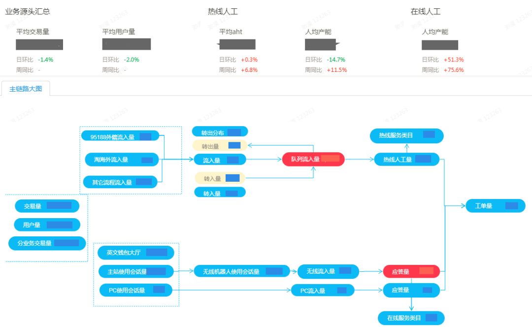 以往运营同学看的是各个环节的数据点报表,在我们构建的分析产品中,业务同学看到的是随业务流程变化的全链路图,整个链路图可定制、指标节点可设置预警高亮,从用户使用自助服务,到拨打热线电话,进入智能派单环节,再到人工客服接起,转入转出,升级提交工单,整个链路上哪一个节点出现异常一目了然。