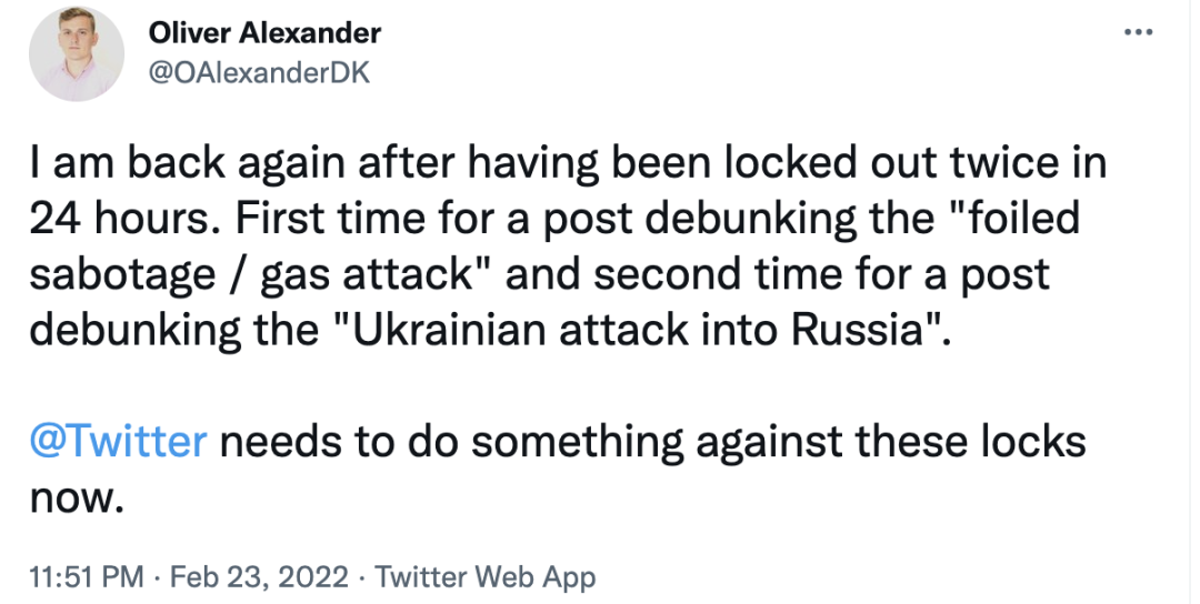 推特将这一事件归咎于一个管制错误。相关人士称,如果乌克兰部分地区断网同时此类封号变得普遍,人权受侵犯的风险就会增加。