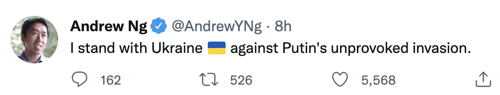 AI大牛吴恩达,「我支持乌克兰,反对普京无端入侵。」