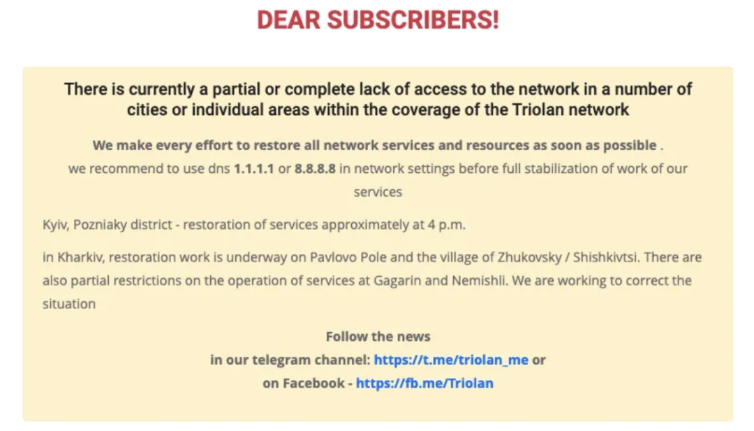中断正在影响Triolan互联网服务提供商,该公司服务于包括哈尔科夫在内的许多城市和其他地区。