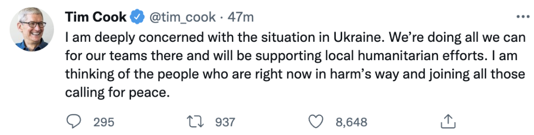 苹果CEO库克,「我对乌克兰局势深感关切,我们的团队正尽自己所能,支持当地人道主义工作。我无时无刻都在挂念处在水生火热之中的乌克兰人民,我要加入那些呼吁世界和平的阵列。」