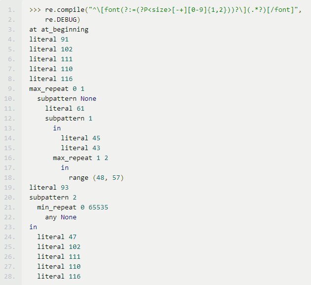 正则表达式是Python的一大特色,但是调试起来会很痛苦,很容易得出一个bug。幸运的是,Python可以打印出正则表达式的解析树,通过re.debug来显示re.compile的完整过程。