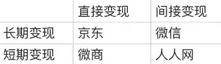 “直接变现”和“间接变现”差别呢,可以用京东和微信的例子来简单的感受一下:京东诞生,就是做线上零售的,人们比较自然的愿意为了这个日常需求直接买单;而人们显然并不愿意(或者不习惯)为了微信的主要功能“聊天”而付费,所以微信的变现手段都是衍生出的间接的,比如微信钱包、理财、朋友圈广告等等。