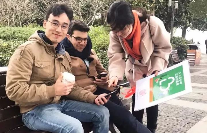 因为语言问题,今天他一开始只能在后面跟着大家举牌子,但他努力的学习中文说“公益三小时”,去和陌生的路人主动沟通,值得点赞!
