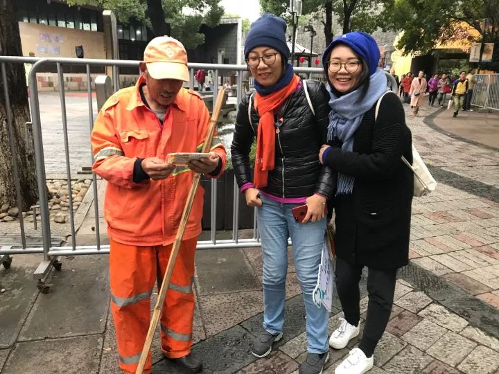 这位环卫工人没有手机,没办法加入我们的实验。阿里小二送他一个暖宝宝,让他在冬天杭州的寒风里,能温暖下自己。