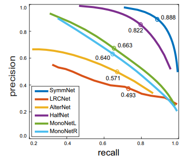 图3 PR曲线。在 PR 曲线上标注了最大 Fscore。曲线越靠近右上角代表该模型的表现更好。因此我们可以看到 SymmNet 的表现由于其他两种变体结构。