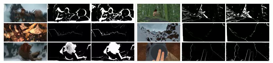 图6 模型在 MPI 数据集上的定性结果。从左到右依次是:两个输入帧的平均图像;真实的遮挡物图像;我们模型预测的遮挡物图像。