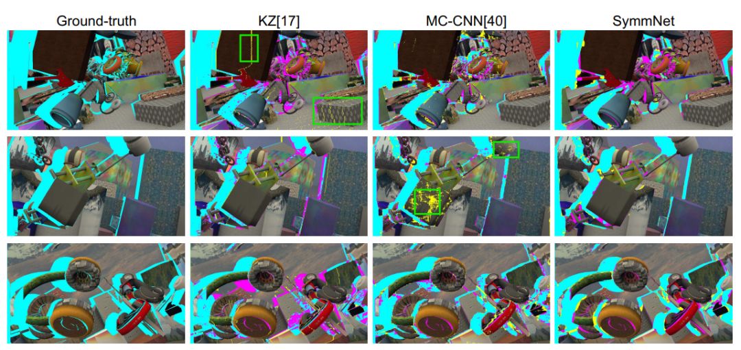图4 SceneFlow 数据集的定性结果。真正的正样本 (true positive) 估计用青色标记,假阴性 (false negative) 用洋红色标记,假阳性 (false positive) 用黄色标记。绿色框标记错误发生在第一行中倾斜平面上以及第二行中无纹理区域。