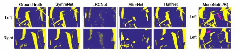 我们提出的 SymmNet 模型能够直接对输入图像的遮挡进行建模,无需基于视差计算的先验知识。从结果上看,我们的模型明显优于其他变体结构,验证了 SymmNet 模型结构的有效性。