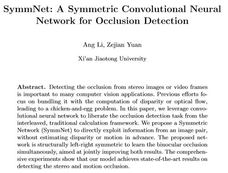 我们提出一个对称的卷积神经网络结构 (SymmNet),它能够直接利用图像对的信息,而无需提前估计视觉差异或动作的影响。我们所提出的网络是一种左右的对称结构,在学习双目下的遮挡问题的同时,旨在共同改善检测结果。通过综合的实验分析来验证我们模型的有效性:实验结果表明,在立体图像和运动遮挡问题中,我们的模型能够取得当前最先进的检测表现。