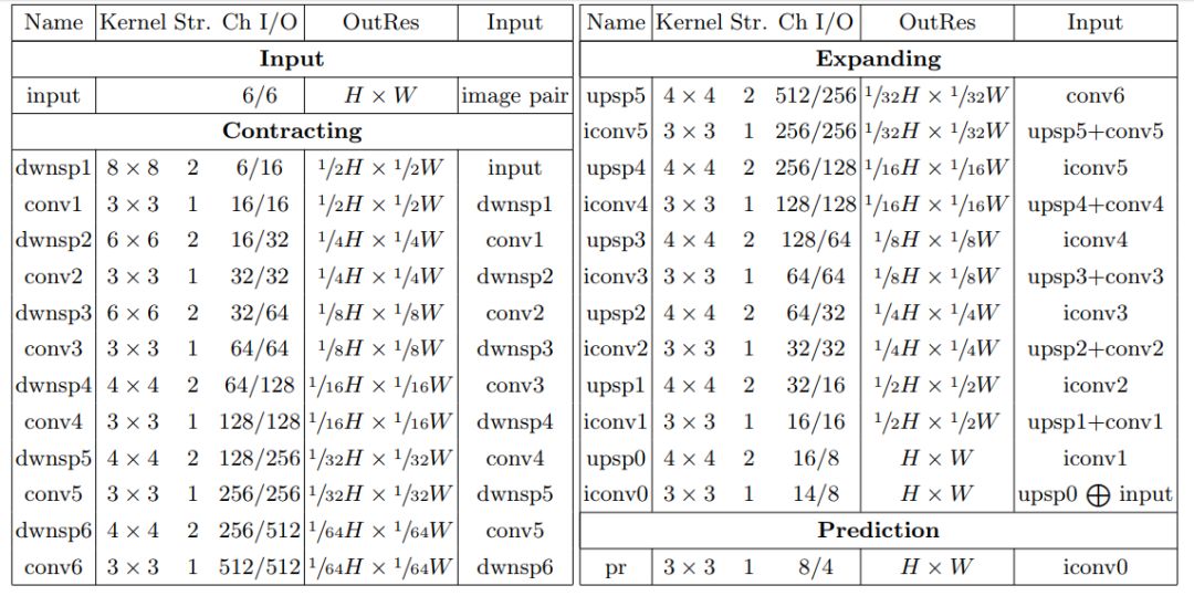 与 FlowNet 结构不同,我们的 SymmNet 模型采取了几种网络修剪策略以提高网络的计算效率。首先,我们对特征通道的数量进行压缩。第一层有16个过滤器。每次对特征映射图的空间大小进行下采样时,网络的特征长度都将翻倍,并在收缩模块的最后一层达到最大值,该层包含512个过滤器。然后,我们更换了跳跃连接中的连接方式,并相应地减小扩展模块的特征长度以匹配收缩模块。另一个修改是我们的网络在扩展模块后又包含一个额外上采样模块,以获得全分辨率的输出。由上采样到全分辨率,原始图像的特征将与最后一层的卷积层特征相连接。这是出于图像低层次特征可以帮助定位遮挡物的考虑而做的处理。