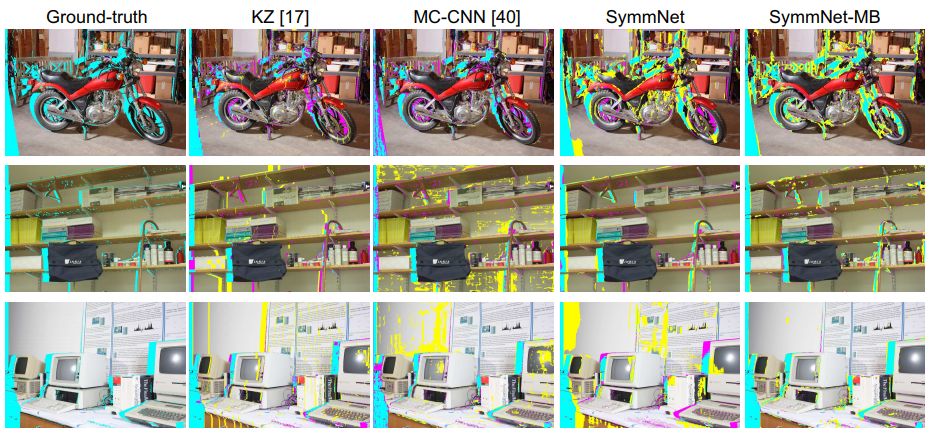 图5. Middlebury 数据集的定性结果。真正的正样本 (true positive) 估计用青色标记,假阴性 (false negative) 用洋红色标记,假阳性 (false positive) 用黄色标记。