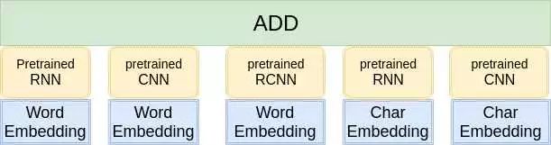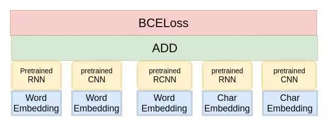 其实模型融合的方式,我们换一种角度考虑,其实就是一个很大的模型,每一个分支就像多通道的TextCNN一样。那么我们能不能训练一个超级大的模型?答案是可以的,但是效果往往很差。因为模型过于复杂,太难以训练。这里我尝试了两种改进的方法。