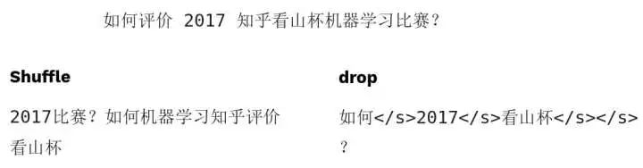 文本中数据增强不太常见,这里我们使用了shuffle和drop两种数据增强,前者打乱词顺序,后者随机的删除掉某些词。效果举例如图: