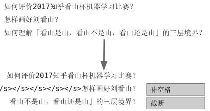 对于不同长度的问题文本,pad和截断成一样长度的(利用pad_sequence 函数,也可以自己写代码pad)。太短的就补空格,太长的就截断。操作图示如下: