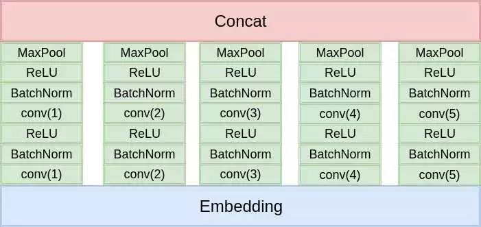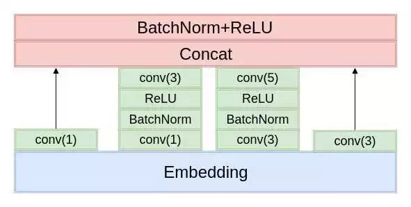 这个是我自己提出来的,参照TextCNN的思想(多尺度卷积核),模仿Inception的结构设计出来的,一层的Inception结构如下图所示,比赛中用了两层的Inception结构,最深有4层卷积,比TextCNN更深。