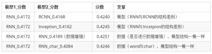 从第一行和第二行的对比之中我们可以看出,模型差异越大提升越多(RNN和RCNN比较相似,因为他们底层都采用了双向LSTM提取特征),虽然RCNN的分数比Inception要高,Inception对模型融合的提升更大。