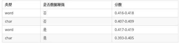 训练的时候,每个模型要么只训练基于词(word)的模型,要么只训练基于字(char)的模型。各个模型的分数都差不多,这里不再单独列出来了,只区分训练的模型的类型和数据增强与否。