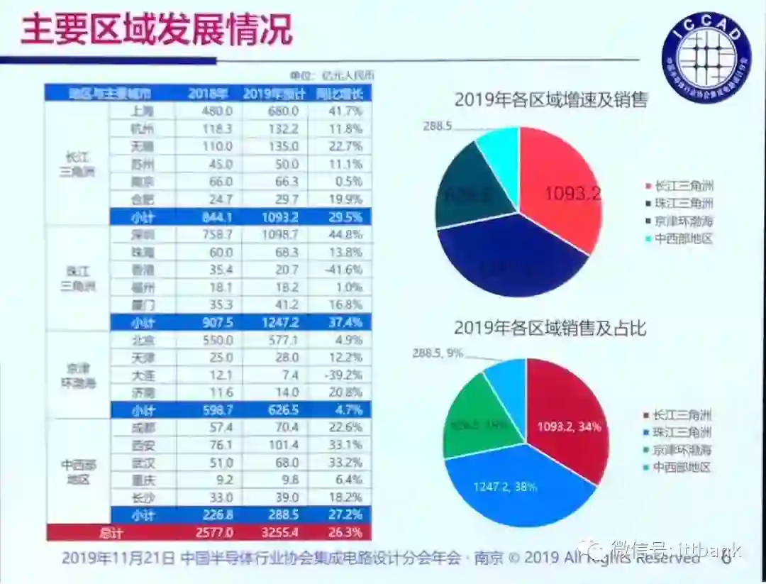 2019年我国集成电路销售额预计将达到3255.4亿元,同比增长26.3%。从地域上看,长江三角洲地区2019年的销售额预计为1093.2亿元,同比增长29.5%;珠江三角洲2019年的销售额预计为1247.2亿元,同比增长37.4%;京津环渤海地区2019年的销售额预计为626.5亿元,同比增长4.7%;中西部地区2019年销售额为288.5亿元,同比增长27.2%。其中,长江三角洲和珠江三角洲,销售额双双超过一千亿,这是历史首次。